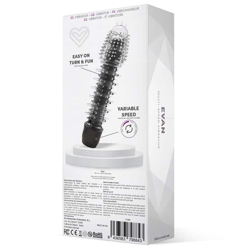 Constructed from premium body-safe silicone, the Evan Multi-Speed Vibe Black is durable and easy to maintain. For optimal hygiene, clean the vibrator thoroughly with a specialized toy cleaner or mild soap and warm water before and after each use. Rinse well and pat dry with a lint-free cloth. Store in a cool, dry place away from other toys to preserve its material integrity. For the best experience, always use with a water-based lubricant. Requires 2 AAA batteries (not included).